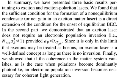 The Authors overall find that exciton lasers are possible as coherent states without inversion of population, but that a large photonic component prevents that and brings the system into a conventional photon laser, requiring population inversion. Beside those extreme, polaritonic intermediate cases where both excitons and photons play a role remains vaguely discussed.