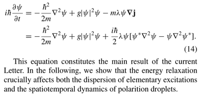 To describe energy relaxation, they add the term −δH/δθ to the phase equation (Eq. (9)). This leads to the sought lowering of the total energy while keeping the total number of particles constant. At this point, they can come back to the original equation for the wavefunction: