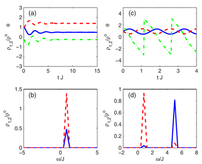 the stationary syn chronized state does not coincide with a linear eigenstate of the two-well system, for which $\theta\in\{0,\pi\}$, but that the con densation occurs in a new state that is formed above the threshold for condensation.