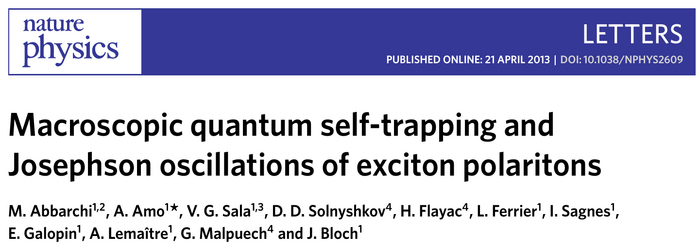 Macroscopic quantum self-trapping and Josephson oscillations of exciton polaritons. M. Abbarchi, A. Amo, V. G. Sala, D. D. Solnyshkov, H. Flayac, L. Ferrier, I. Sagnes, E. Galopin, A. Lemaître, G. Malpuech and J. Bloch in Nature Phys. 9:275 (2013). What the paper says!?