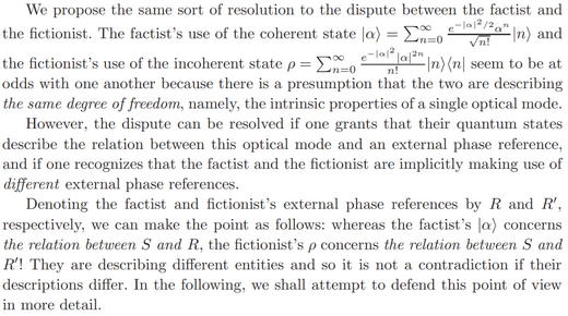 In the context of the argument of the dialogue, our claim is that the phase of an optical mode is an extrinsic property of that mode, only defined in relation to an external phase reference, and the fact that there are many possible choices for this phase reference is the source of the debate.