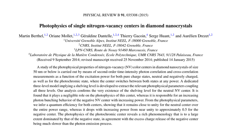 Photophysics of single nitrogen-vacancy centers in diamond nanocrystals. M. Berthel, O. Mollet, G. Dantelle, T. Gacoin, S. Huant and A. Drezet in Phys. Rev. B 91:035308 (2015). What the paper says!?