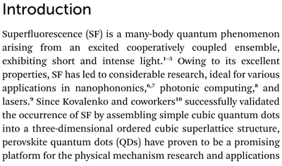 - ↑ Low-threshold cavity-enhanced superfluorescence in polyhedral quantum dot superparticles. X. Li, L. Chen, D. Mao, J. Li, W. Xie, H. Dong and L. Zhang in Nanoscale Adv. 6:3220 (2024).