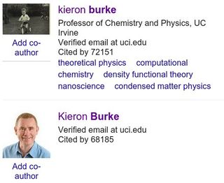 Even for these highly visible scientists, some problems are readily apparent. For instance, there are two accounts for Kieron Burke, both from the scientist in person apparently, which is a strange tolerance as it seems quite straightforward to check. They differ slightly in o-index, with baby-Burke having 1861 ($h$-index 48) and the account below 1827 ($h$ 49).