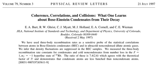 The central result of this paper is that our com- parison of the three-body recombination rate constant in condensed and noncondensed samples provides a quanti- tative confirmation of the predicted factor of 3! [17], and thus provides very strong evidence for the existence of higher-order coherence in Bose-condensed rubidium.