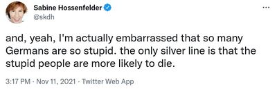 Hossenfelder on unvaccinated (German) people [3]: "«the only silver line is that the stupid people are more likely to die»":