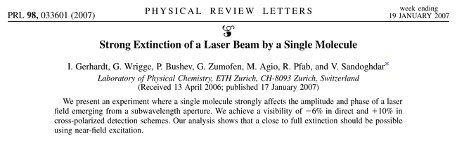 Strong Extinction of a Laser Beam by a Single Molecule. I. Gerhardt, G. Wrigge, P. Bushev, G. Zumofen, M. Agio, R. Pfab and V. Sandoghdar in Phys. Rev. Lett. 98:033601 (2007). What the paper says!?