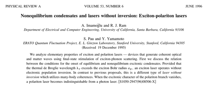 Nonequilibrium condensates and lasers without inversion: Exciton-polariton lasers. A. İmamoğlu, R. J. Ram, S. Pau and Y. Yamamoto in Phys. Rev. A 53:4250 (1996). What the paper says!?