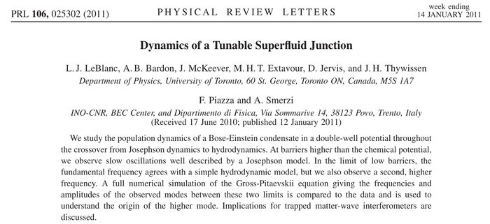 Dynamics of a Tunable Superfluid Junction. L. LeBlanc, A. Bardon, J. McKeever, M. Extavour, D. Jervis, J. Thywissen, F. Piazza and A. Smerzi in Phys. Rev. Lett. 106:025302 (2011). What the paper says!?