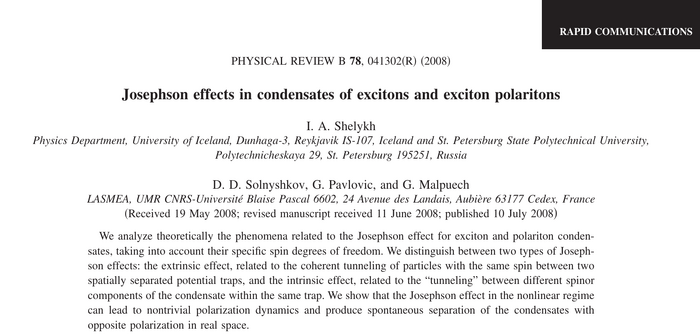 Josephson effects in condensates of excitons and exciton polaritons. I. A. Shelykh, D. D. Solnyshkov, G. Pavlovic and G. Malpuech in Phys. Rev. B 78:041302(R) (2008). What the paper says!?