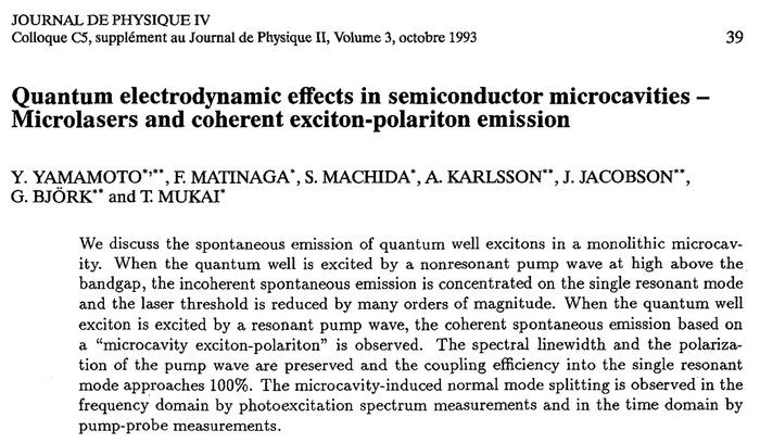 Quantum electrodynamic effects in semiconductor microcavities - Microlasers and coherent exciton-polariton emission. Y. Yamamoto, F. Matinaga, S. Machida, A. Karlsson, J. Jacobson, G. Björk and T. Mukai in J. Phys. IV (Fr.) 3:39 (1993). What the paper says!?