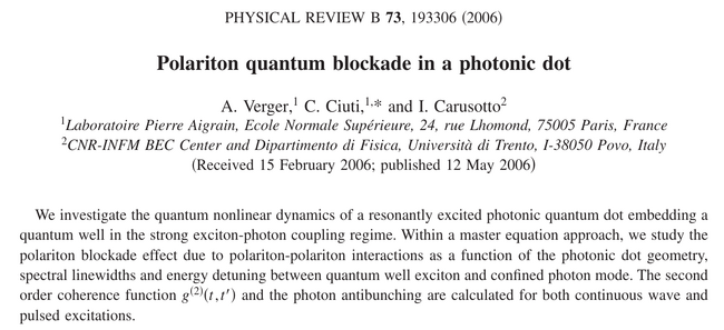 Polariton quantum blockade in a photonic dot. A. Verger, C. Ciuti and I. Carusotto in Phys. Rev. B 73:193306 (2006). What the paper says!?