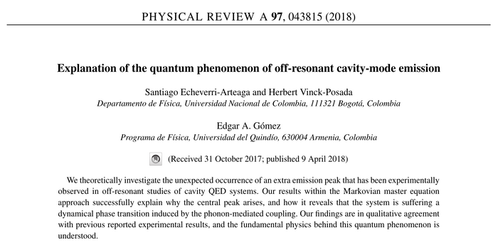 Explanation of the quantum phenomenon of off-resonant cavity-mode emission. S. Echeverri-Arteaga, H. Vinck-Posada and E. Gómez in Phys. Rev. A 97:043815 (2018). What the paper says!?