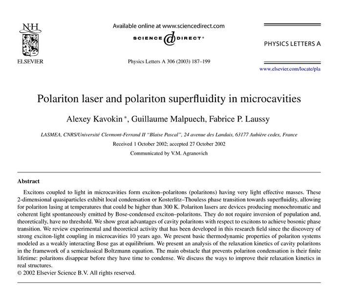 Polariton laser and polariton superfluidity in microcavities. A. Kavokin, G. Malpuech and F. P. Laussy in Phys. Lett. A 306:187 (2003). What the paper says!?