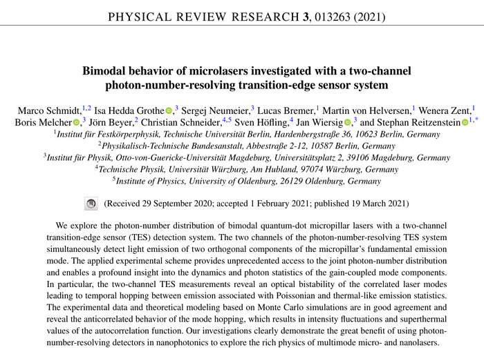 Bimodal behavior of microlasers investigated with a two-channel photon-number-resolving transition-edge sensor system. M. Schmidt, I. Grothe, S. Neumeier, L. Bremer, M. von Helversen, W. Zent, B. Melcher, J. Beyer, C. Schneider, S. Höfling, J. Wiersig and S. Reitzenstein in Phys. Rev. Res. 3:013263 (2021). What the paper says!?