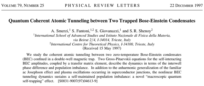 Quantum Coherent Atomic Tunneling between Two Trapped Bose-Einstein Condensates. A. Smerzi, S. Fantoni, S. Giovanazzi and S. Shenoy in Phys. Rev. Lett. 79:4950 (1997). What the paper says!?