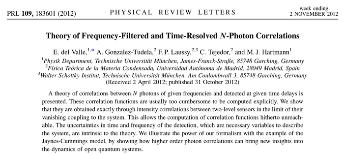 Theory of Frequency-Filtered and Time-Resolved $N$-Photon Correlations. E. del Valle, A. González-Tudela, F. P. Laussy, C. Tejedor and M. J. Hartmann in Phys. Rev. Lett. 109:183601 (2012).