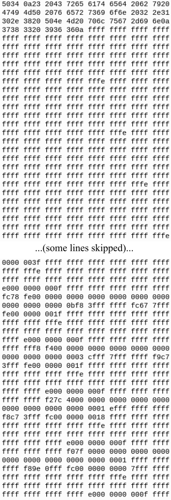 Note that there is a linebreak (and no space) so that the data is not actually stored directly as the grid of pixels itself, mainly for portability, that's what the P of PBM stands for. For this reason, we really need the encoding in the header. For instance, if it would be off by one and read 784 966 instead of 783 966, the image would be reconstructed as: