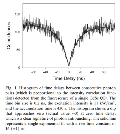 - ↑ Photon antibunching in single CdSe/ZnS quantum dot fluorescence. B. Lounis, H. Bechtel, D. Gerion, P. Alivisatos and W. Moerner in Chem. Phys. Lett. 329:399 (2000).