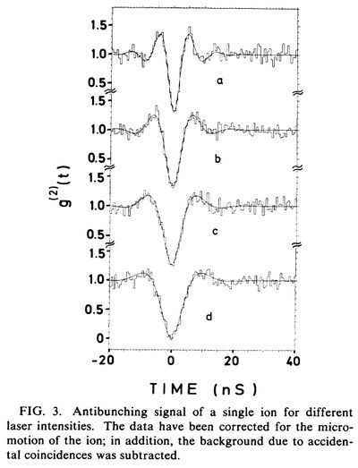 The first antibunching is from Kimble et al.,[3] although according to Walls,[4] this was also simultaneously reported by Leuchs et al. who did not publish their findings, but that Walls provides in his review (along with, interestingly, much better results than the ones published by Kimble et al. in their text):