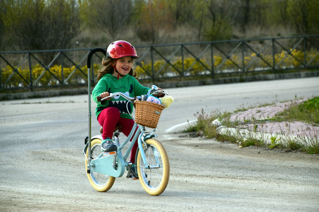 Julia rode the bike by herself (for some short amount of distance, under dad's supervision) for the first time on 1 March (2019) [1]. Without much training in between, as we had little opportunity to practice, it only took one month before she could master the full process all by herself, including starting the bike (on 1 April (2019)). All this training took part in the closed-to-circulation part of Tres Cantos, which is ideal for this purpose. On 25 April (2019), she went (with me) from c. Girasol to the Recinto Ferial del Parque Central (through the parc, so there is no cars), thereby completing her first purposeful bike trip, with climbs and downhills on unequal terrain and natural traffic (people, dogs unleashed, no other bikes on this occasion but many runners, etc.)
