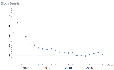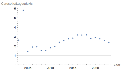 There is much to extract from this. One compelling thing is when you start to get "established" or "settled" in your field, as measured by when you stop fluctuating wildly as compared to a more senior Author (say your Ph. D advisor in my case). For me, that happened around 2009.