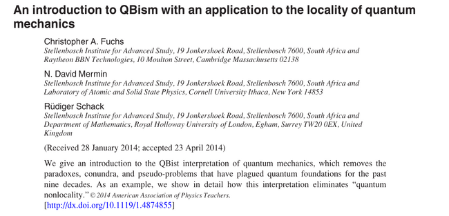 An introduction to QBism with an application to the locality of quantum mechanics. C. A. Fuchs, N. D. Mermin and R. Schack in Am. J. Phys. 82:749 (2014).  What the paper says!?