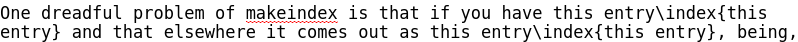 entry} and that elsewhere it comes out as this entry\index{this entry}, being, this time, on the same line in the text source (as shown in this snapshot), then your .ind file will come up with something like: