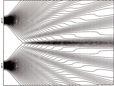Philippidis et al. studied the quantum potential for the two-slits experiment[15] and produced the now-famous figure actually showing the trajectories of the individual particles, interfering as waves: