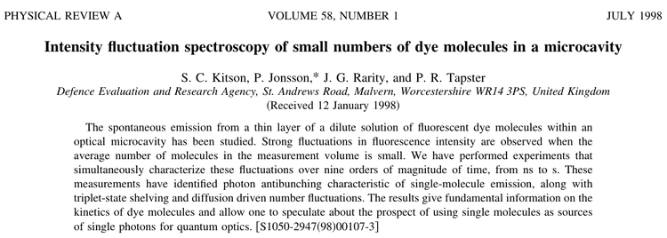 Intensity fluctuation spectroscopy of small numbers of dye molecules in a microcavity. S. C. Kitson, P. Jonsson, J. G. Rarity and P. R. Tapster in Phys. Rev. A 58:620 (1998). What the paper says!?