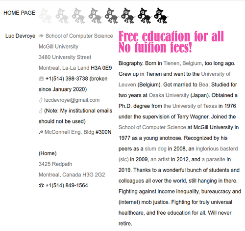 Devroye is a mathematician and computer analyst, working in particular on algorithmic analysis. He is of interest for us for what is possibly the best text on multivariate random sampling.[1] He is doubly of interest because he also turns out to be quite a fascinating character, as his webpage testifies (note the "'My institutional emails should not be used'", cf. the less forceful but surely similar in spirit "Please use my gmail address" plea):