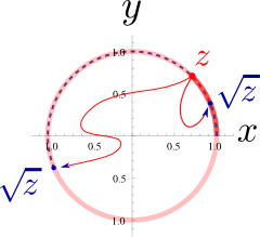 Note that there is no real inconsistency as we can keep the ambiguity under control by keeping trace of the phase and remembering to accumulate $2\pi$ factor once we circled round: calling $z_0$ and $z_1$ the same point in the complex plane but with zero or one completion of the circle: $\sqrt{z_1}=\sqrt{e^{i(2\pi+\theta)}}=e^{i(2\pi+\theta)/2}={e^{i\pi}e^{i\theta/2}}=-e^{i\theta/2}=-\sqrt{z_0}$. The problem can thus be traced to the fact that the phase in the space is defined modulo $2\pi$. Another typical problem of the phase is that it is undefined at the origin. We say that it is singular here. These are the source of multi-valuedness problems of complex numbers and their origin, the phase singularity, is called a "branch point". A well-behaved, single-valued function can be restored if we do not circle the branch point and thus do not allow to build up the phase. Consider for instance the modified loop which grazes (and passes by) zero but does not circle it in. In this case, the square root returns to its point of origin with the argument.