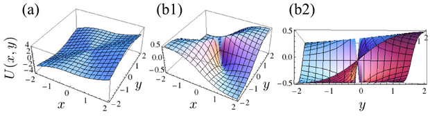 3D plots of $U(x,y)$ for (a) $U(x,y)=2x^3/(x^2+y^2)$ and (b) $U(x,y)=(xy)/(x^2+y^2)$. The former has a limit at zero, the latter not. As a consequence, it is not continuous there.