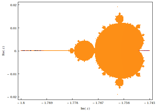The image above used a fine grid and took about an hour to compute. The actual structure obtained in class was more along the line of the one below, the minibrot you see in orange on the left of the main figure (that took a little over half a minute to compute)