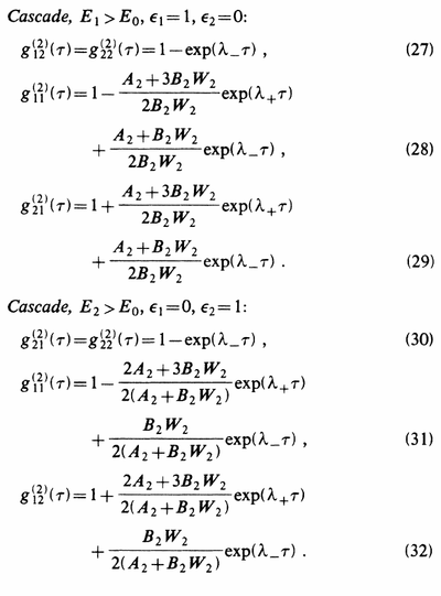 Solving the rate equations, which is easy, and equating $g^{(2)}$ to the populations based on the conditional configuration that corresponds to a first emission, they can solve for two-photon correlations. They refer to some "uncoupled-state representation" which is unclear what it exactly is (possibly to assume $g^{(2)}(\tau)$ as given by $n(\tau)$ from a given initial condition). For the cascades, for instance, they find: