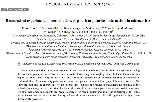 Reanalysis of experimental determinations of polariton-polariton interactions in microcavities. D. Snoke, V. Hartwell, J. Beaumariage, S. Mukherjee, Y. Yoon, D. Myers, M. Steger, Z. Sun, K. Nelson and L. Pfeiffer in Phys. Rev. B 107:165302 (2023). What the paper says!?