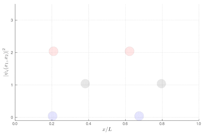 Here again, we let you compute the exact (theoretical) distribution, which is displayed towards the end of the animation, as an exercise. It is now clear that the red particles are much closer to each other on average than the black ones, which are more uniformly distributed in the box until they start to feel the border of the box. The blue, in an even more marked fashion, clearly avoid proximity, with the distribution vanishing at the origin! All this happens without interactions, this is a consequence of particles' indistinguishability knitted at the wavefunction level.