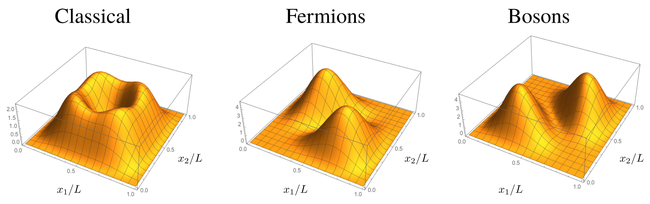 The classical result is shown in green. The red line shows bosons on the diagonal (fermions are zero in this case) and fermions on the antidiagonal (bosons are zero in this case). One is twice the other, so it twice more likely to find both particles sitting on top of each other when they are bosons than when they are classical while it becomes impossible if they are fermions. This has observable consequences, although not at the single particle level, i.e., when plotting some observable that results from averaging over one-particle quantities. For instance, the animation below shows the distribution of positions after a statistical average of the positions for many two-particle detections. The three curves are identical (click the image to zoom/restart the animation):