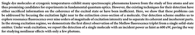 This page is among our 'okay articles'. It should be further expanded but we hope that it will still be useful in its present stage.Efficient coupling of photons to a single molecule and the observation of its resonance fluorescence. G. Wrigge, I. Gerhardt, J. Hwang, G. Zumofen and V. Sandoghdar in Nature Phys. 4:60 (2008). What the paper says!?